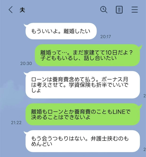 この記事では、LINEでケンカになりそのまま別居、夫から離婚だと言われたという投稿を紹介します。新居を建ててまだ日が浅く、ローンも残っている状態。夫はローンは払うとは言うものの養育費については言及がなく、そういったところも投稿者さんは不安を感じているそう。顔を合わせたくない、弁護士は挟みたくないと夫は言うものの、どこにいるのかもわからず話し合うことすら難しいことから、どうしたらいいのか悩んでいるそうです。