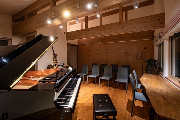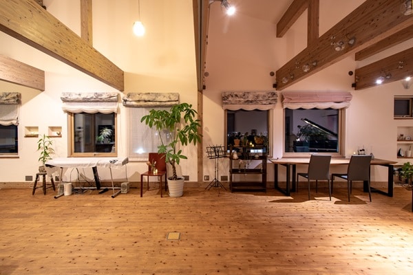 「Merry Echoes」は、グランドピアノを常設し、木のぬくもりと吹き抜けによる自然な響きを大切にした空間。少人数向けの「ピアノスペース(定員約1〜10名)」に加え、キッチン付きのマルチスペース、イベント向けのフルスペース(最大35名)も備えている。