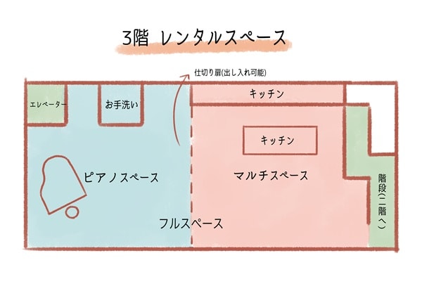 ピアノとキッチンの使用料は別途必要。ピアノとキッチンの使用料はそれぞれ、2時間+1,000円(税込)で延長料金1時間+500円となっている。