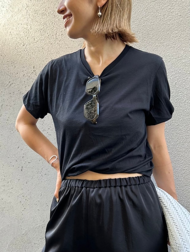 「バルーンディテールのTシャツのフォルムを生かしたシンプルなスタイリングにしました。ラフな印象が強くりがちなTシャツコーデは、ツヤ感のあるボトムを合わせて女性らしい雰囲気に。夏のオールブラックスタイルに真っ白のバッグをアクセントにプラスして、全体が重く見えないように意識しました」
