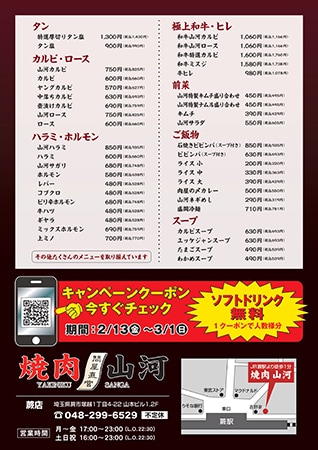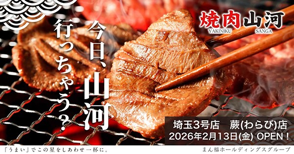 まん福ホールディングスグループのサンフレッシュミートが運営する「肉問屋直営 焼肉山河」は、2月13日(金)、埼玉県内3店舗目となる「焼肉山河 蕨店」をオープンした。場所はJR京浜東北線「蕨駅」東口から徒歩約1分。オープンを記念して、2月22日(日)まで人気メニューを特別価格で提供するキャンペーンも開催される。