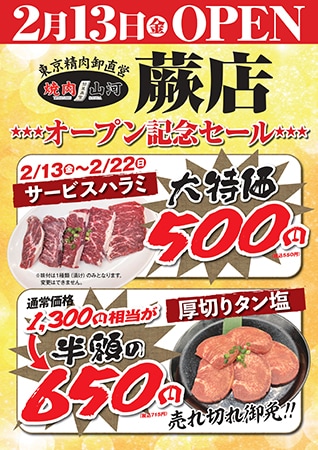 2月13日(金)~22日(日)の期間限定で、オープン記念セールも開催中だ。人気メニューのハラミ、厚切りタンを特別価格で提供する。