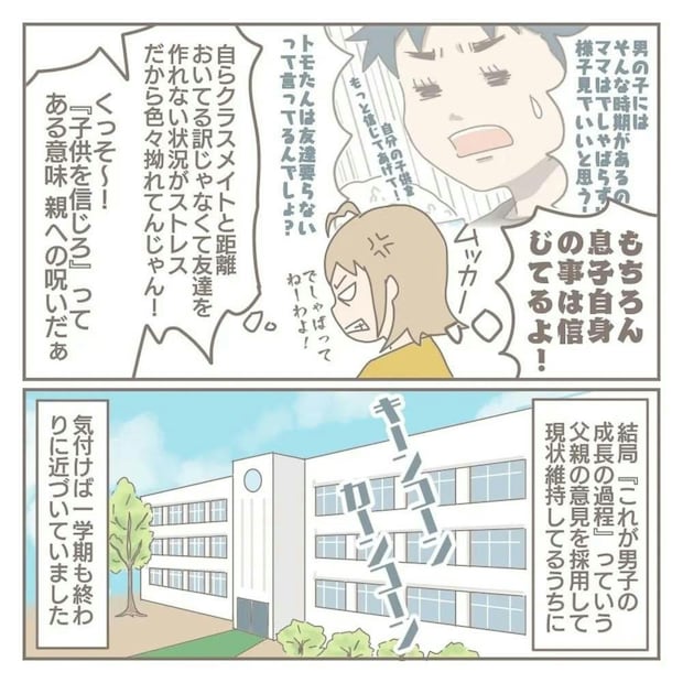 夫の、見守るという方針に沿いきれないと判断したヨカさんは、個人面談で担任の先生に相談をします。