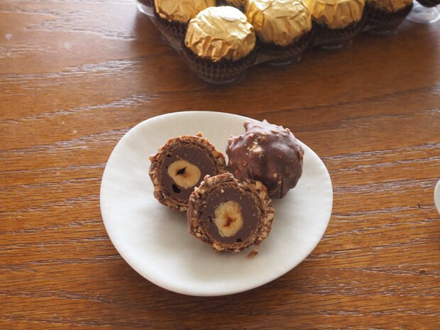 細かく砕いたヘーゼルナッツを混ぜたチョコレートで外側をコーティングし、内部には砕いたウエハースとヘーゼルナッツクリーム、そして中心に丸ごと1粒の大粒ヘーゼルナッツが入った、まさにヘーゼルナッツを堪能できる構成です。