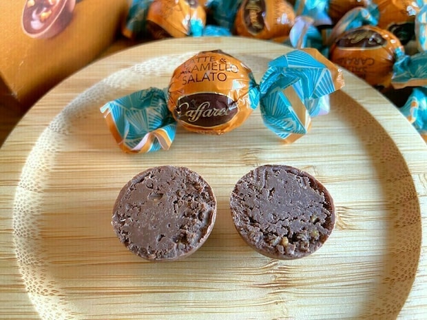 滑らかなチョコレートフィリングをミルクチョコレートで包んだ構造になっており、フィリング内には塩キャラメルチップが練り込まれています。