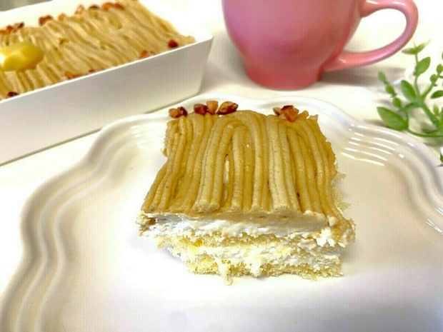 表面にはマロンクリームがぎっしりと絞られ、中央には栗のシロップ漬け、端にはクラッシュアーモンドがトッピングされていて、食感の良いアクセントになっています。