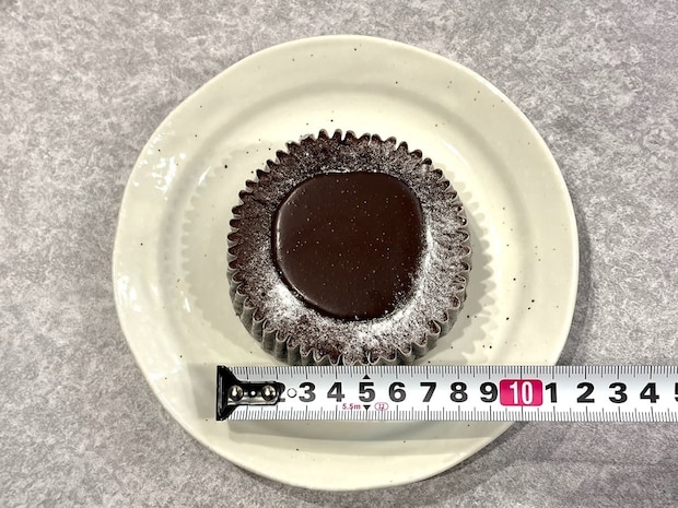 メジャーでサイズを測ってみたところ、直径約8.5cmでフォンダンショコラとしては大きい印象。手で持ってみると、ずっしりとした重さがありました!