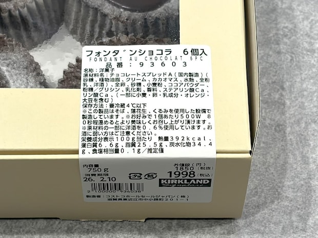 フォンダンショコラが6個入って、価格は1,998円(税込)。1,000円台から2,000円台後半まで価格帯の広いコストコスイーツですが、フォンダンショコラは比較的手に取りやすい価格と言えるのではないでしょうか!?