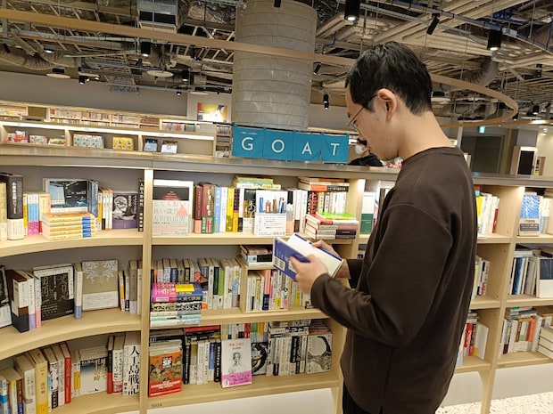 このカフェラウンジの本棚は、売り場とは違って少し雑然とした印象を受ける。本が表紙を向けて置かれたり、平らに積まれたり、上部の隙間に差し込まれていたりする。まるで、友達の家の本棚を覗いているようだ。これは「あえて」のことで、棚を眺めている時の視覚的な引っかかりを生むためだという。