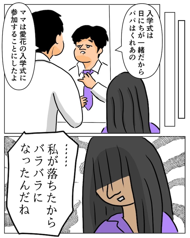 それから月日が流れ、今日は中学校の入学式。だけどくれあは今もなお、不合格のショックから抜け出せずにいました。達夫さんが支度をしながら「入学式は日にちが一緒だからパパはくれあの、ママは愛花の入学式に参加することにしたよ」と伝えると、くれあはうつむいて「・・・私が落ちたからバラバラになったんだね」とつぶやきました。