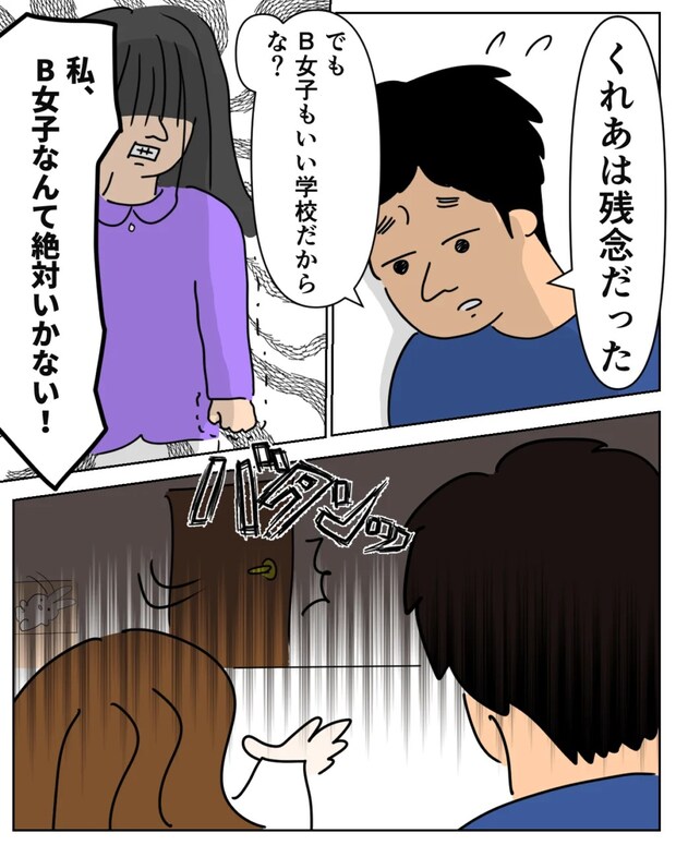 「くれあは残念だった・・・でもB女子もいい学校だから、な?」くれあを元気づけようと達夫さんがそう声をかけるも、「私、B女子なんて絶対いかない!」と声を荒げて、部屋に閉じこもってしまいました。