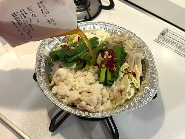 テイクアウト時に、電子レンジで仕上げるタイプか、ガスコンロ・IHで加熱して仕上げるタイプの2種類から選ぶことができるメニュー。筆者はガスコンロ・IHで加熱して仕上げるもつ鍋を選択しました!