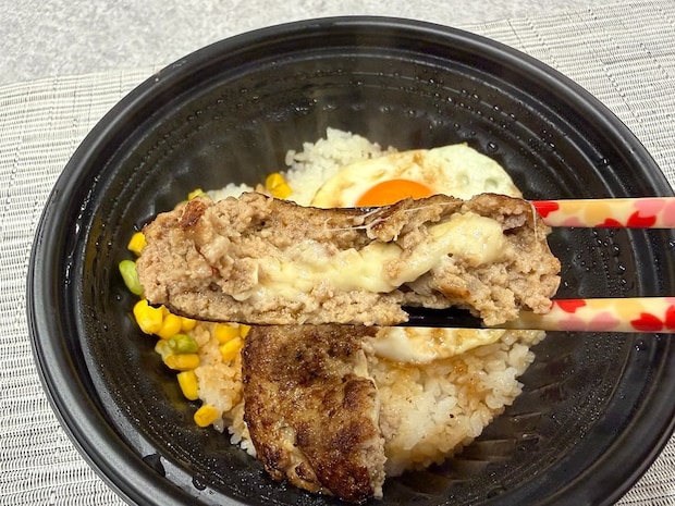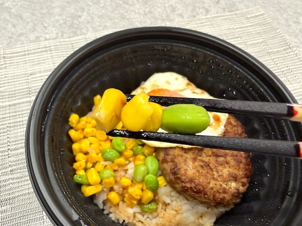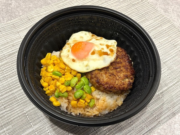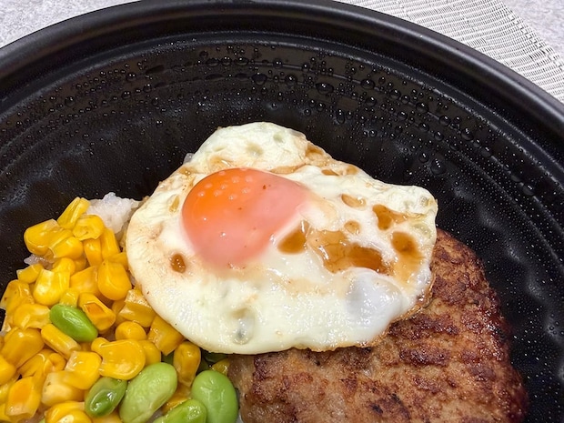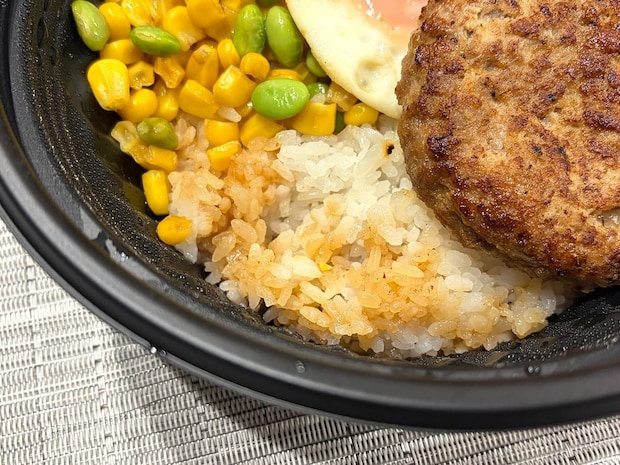 ご飯にミニチーズINハンバーグ、目玉焼き、コーン、枝豆をトッピングしたロコモコ丼。価格は760円(税込)と、比較的安価なテイクアウトメニューとなっています。