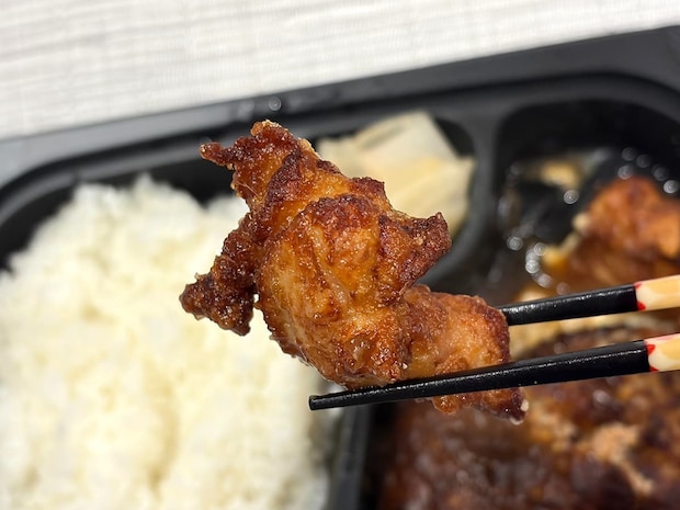 最初にメインのから揚げを実食。非常に柔らかいから揚げで、しっとりとした食感の中に旨味が凝縮されています。