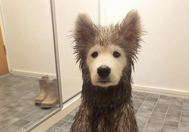 二度にしちゃうような面白い汚れ方をした犬さん。