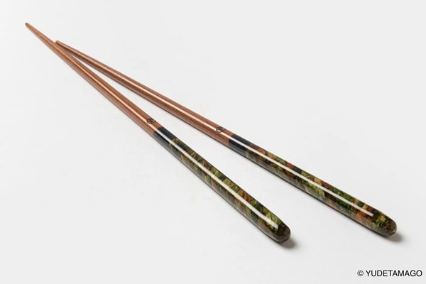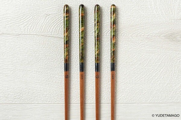 迷彩模様もひとつとして同じものがない、職人の手しごとならではのアートな一膳は、単なる道具としての箸ではなく、毎日の暮らしと食卓に彩りを添える逸品となっている。