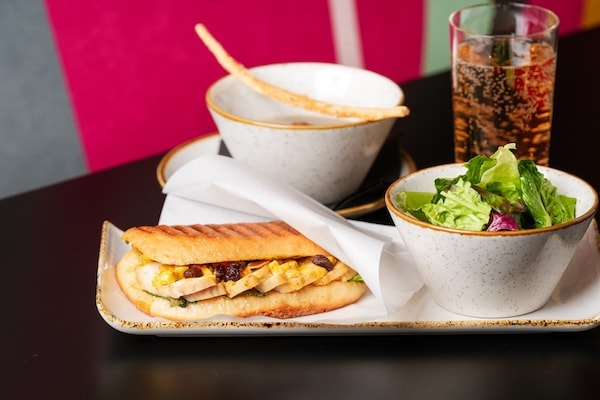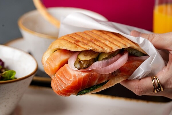 ランチタイムには、春らしい彩りが目を引く「サーモンパニーニ」が登場。