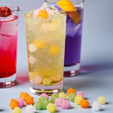 レモンをインフューズした焼酎に、おもちゃ箱に詰め込むようにこんぺいとうをたっぷりと入れて、優しい甘さに仕上げた「こんぺいとうサワー」、