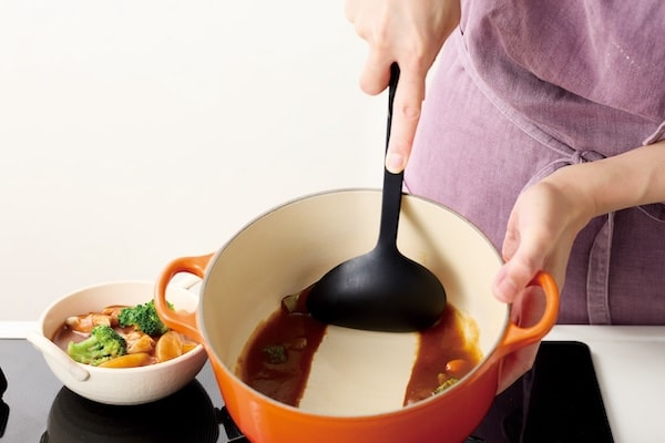 このお玉一本で「注ぐ・残さず掬う・置ける」ができるため、洗い物が増えにくく、調理から盛り付けまでをスムーズにつなぐことができる。