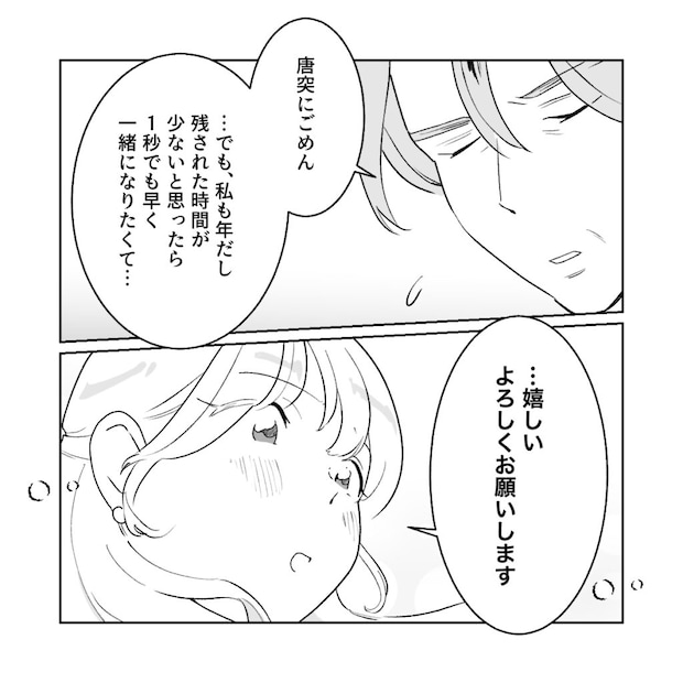 すると、「唐突にごめん。・・でも、私も年だし、残された時間が少ないと思ったら、1秒でも早く一緒になりたくて・・」和男さんにそう言われ、「・・嬉しい。よろしくお願いします」と素直に答えている自分がいました。