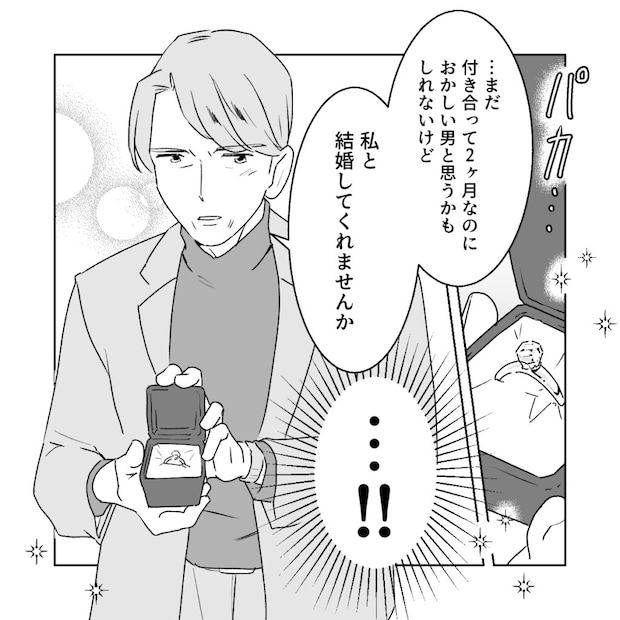 「・・まだ付き合って2か月なのにおかしい男と思うかもしれないけど、私と結婚してくれませんか」そう言ってアクセサリーケースを開くと中には指輪が!「・・!!」あまりに突然のことで言葉が出ない私。