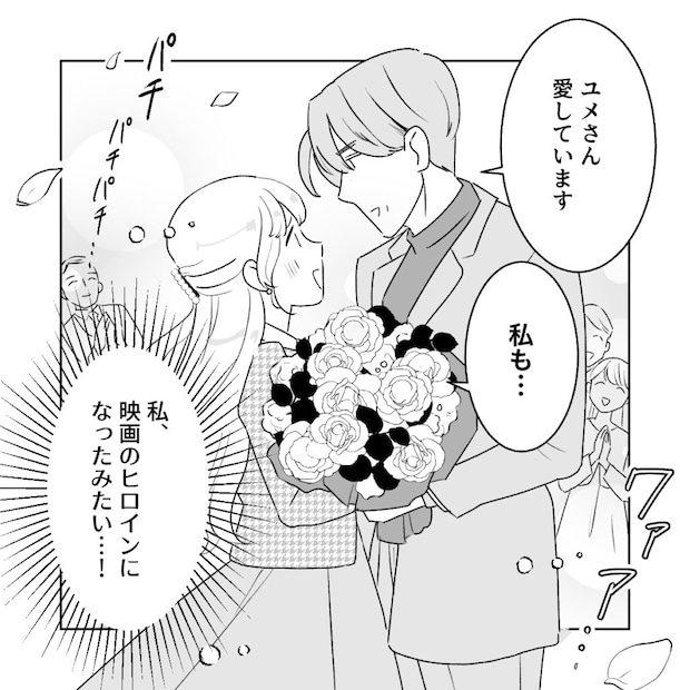 「ユメさん愛しています」「私も・・」レストランで立ち上がりプロポーズを受ける私は、大きな花束を抱えながら「私、映画のヒロインになったみたい・・!」とドキドキしていました。