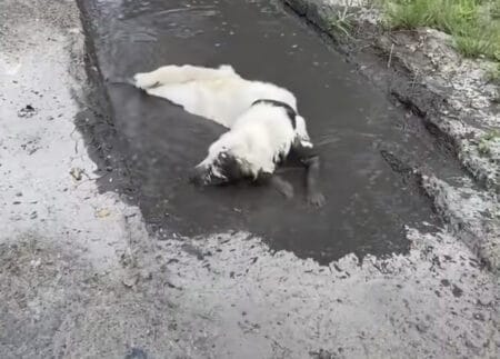全身に泥を塗って遊ぶ犬さんを見て