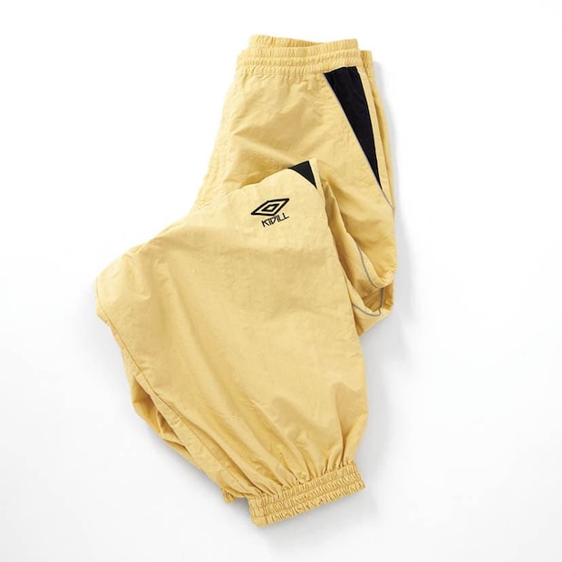 「下半期のマイブームのカラーは卵色! なんだか可愛くて、無性に心惹かれています。このページで着ているパンツも卵色ブームの流れで購入!」。キディル×アンブロのトラックパンツ/本人私物