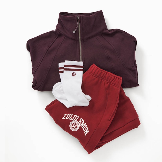 「娘たちが着ているのを見てマネしました! これまで見逃していたのを悔やむくらい可愛い。卵色と並んで注目しているカラーのエンジのアイテムを購入」。ルルレモンのハーフジップトップス、ソックス、トラックパンツ/全て本人私物