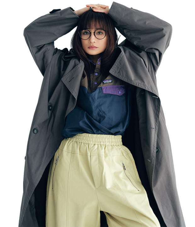 ヴィンテージのクリスチャン ディオールのトレンチコート、ヴィンテージのパタゴニアのフリーストップス、プランクプロジェクトのパンツ、メガネ/全て本人私物