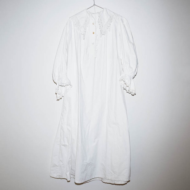 「オールドコットンの風合いが最高。黒のドレスや大きめのセーターを重ねて、襟や袖を見せる着方で♡ 最終的にはカットしてブラウスとスカートにしちゃう?と構想中」。トロ ヴィンテージ クロージングで購入したドレス/本人私物