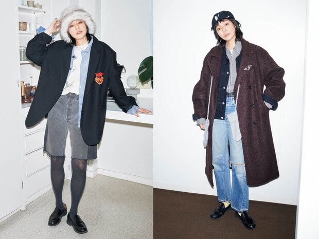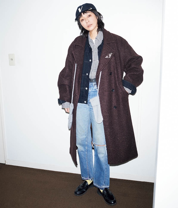 アンヌークのコートとミトン、リーバイスのデニムジャケットとデニムパンツ、マルニのギンガムチェックジャケット、ビズヴィムのキャップ、コートに付けたヴィンテージのブローチ、マーガレット・ハウエルの靴下、サンダースのローファー/全て本人私物