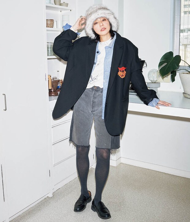 フランキー ショップのジャケット、セントマイケルのデニムジャケットとロンT、ザラのハット、ジャケットに付けたボーディのブローチ、小指に着けたスウェードのリング、ファルケのタイツ、サンダースのローファー/全て本人私物