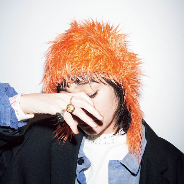 「一瞬、髪の毛!? と見まがう(笑)、毛足長めのビーニー。この絶妙な違和感がとにかく新鮮だし、被るとだらーんとなる無縫製ならではのフォルムもいいの」。イッセイ ミヤケのニットビーニー、 リング[中指]キウナ、[薬指]ブラミンク、[小指]スウェード/全て本人私物