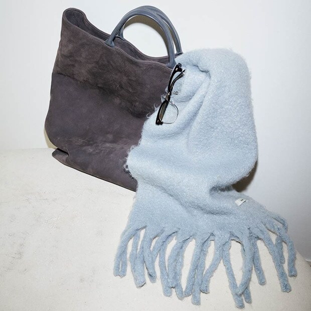 「荷物多めな私にぴったりの大容量トートは、タフなヌバックレザーでガシガシ使える。アイスブルーのストールとの配色バランスがツボ」。エイトンのバッグ、アンヌークのストールとメガネ/全て本人私物