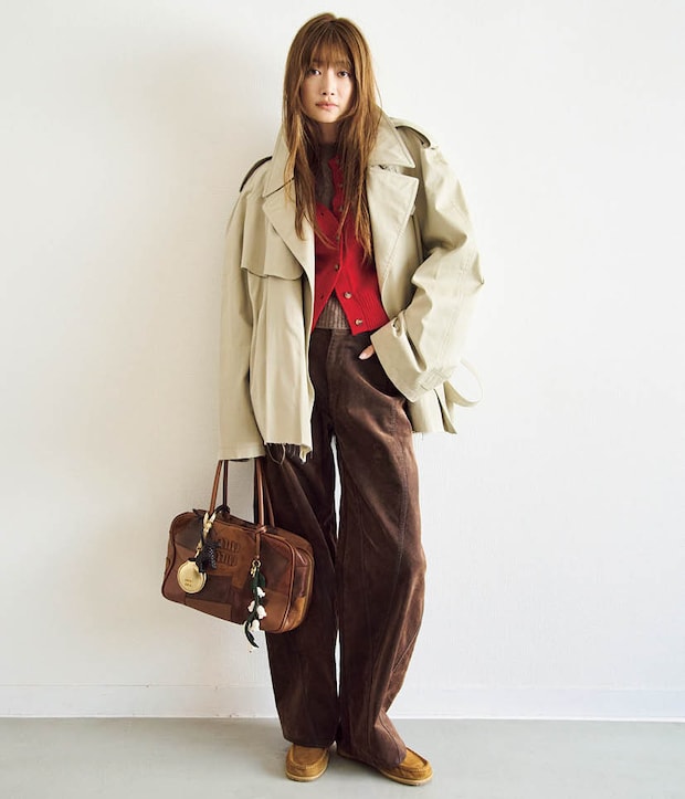 バレンシアガのトレンチコート、シシクイのカーディガン、サカイのパンツ、コエルのバレルレッグパンツ、ミュウミュウのバッグ、ジャックモスのモカシン/全て本人私物