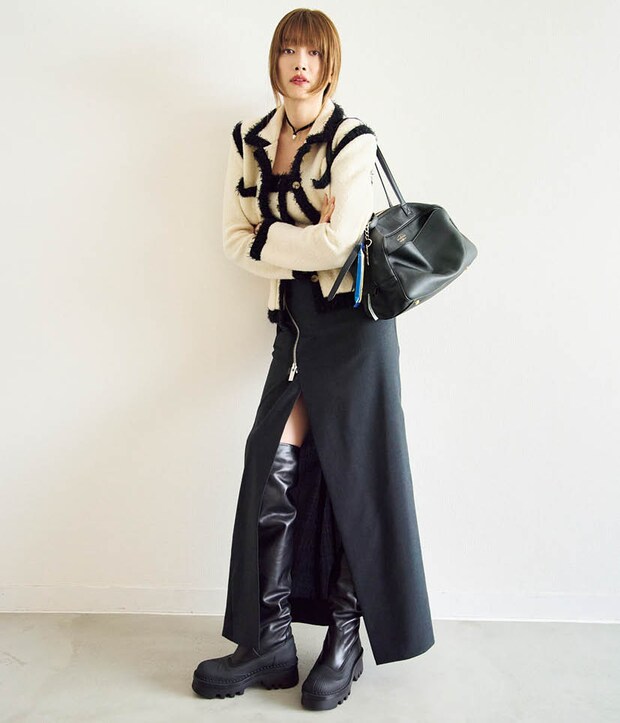 フェティコのカーディガンとベアトップ、コエルのロングスカート、バレンシアガのバッグ、クロエのロングブーツ/全て本人私物