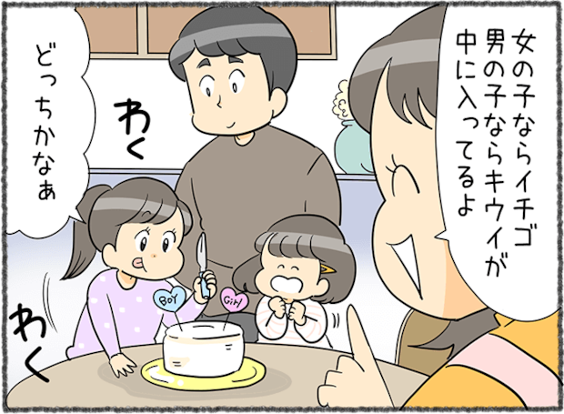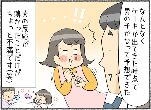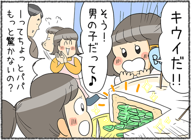 3人目となるお腹の子の性別が分かり、“ジェンダーリビールケーキ”で家族に発表することにしたママさん。これは、ケーキを切ったときに中の色や具材で赤ちゃんの性別を知らせるという、アメリカ発祥のサプライズイベントです。家族で赤ちゃんの誕生を楽しみにしながら、一度きりの特別な瞬間を素敵な思い出にできそうですね。ところが、察しの良いパパさんはあらかじめ予想していたそうで、薄~いリアクションだっだのだとか。「健康なら性別はどちらでもいい」と思いつつ、3人目が男の子だったことへの喜びがついにじみ出てしまったママさんの気持ちも分かりますね(笑)。