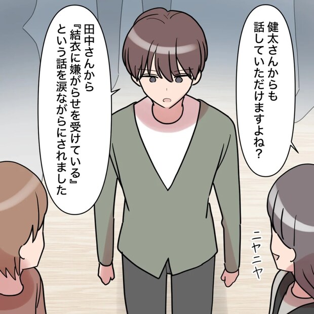 田中さんから「健太さんからも話していただけますよね?」と振られた健太は、「田中さんから『結衣に嫌がらせを受けている』という話を涙ながらにされました」とその場にいる保護者たちに話し始め、その様子を田中さんがニヤニヤしながら見守っていました。