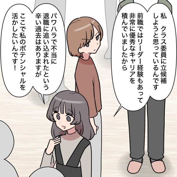「私、クラス委員に立候補しようと思っているんです。前職ではリーダー経験もあって非常に優秀なキャリアを積んでいましたから。パワハラで不当に退職に追い込まれたという辛い過去はありますが、ここで私のポテンシャルを活かしたいんです!」とクラスの保護者たちに熱弁する田中さん。田中さんの言うパワハラとやらは私のことを言っているのでしょう。事実を知っている私の前で堂々と作り話をする田中さんを、私は冷ややかな目で見ていました。
