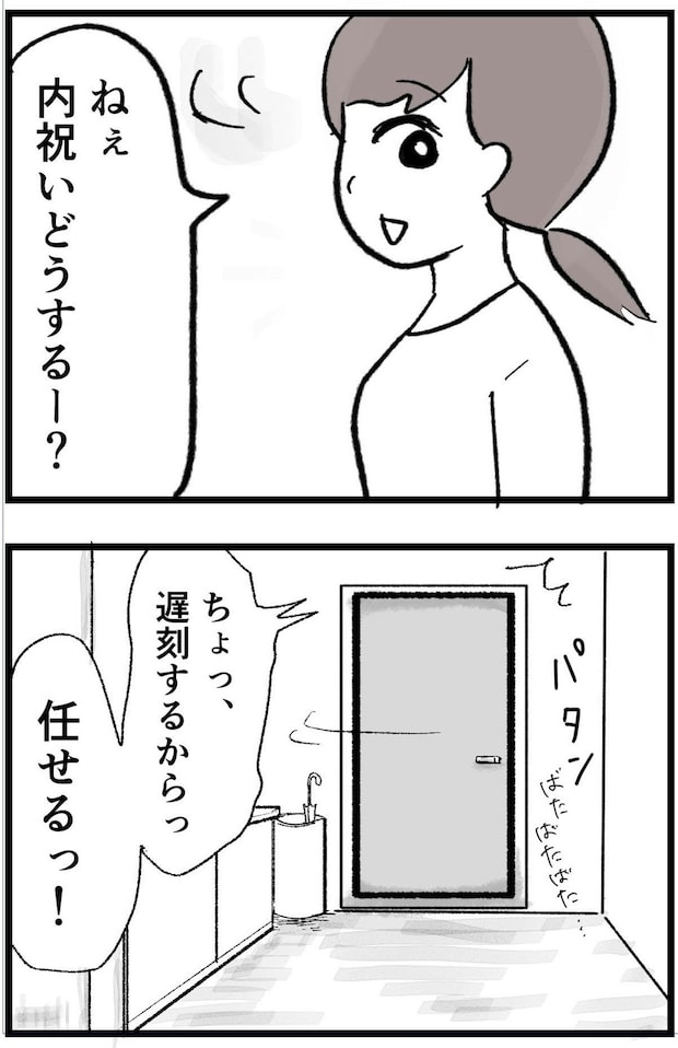 しかし内祝いを相談すると、夫はバタバタと出かける直前に「任せる!」の一言だけ。夫から丸投げされて、まゆさんは静かに悲しさを感じていました。