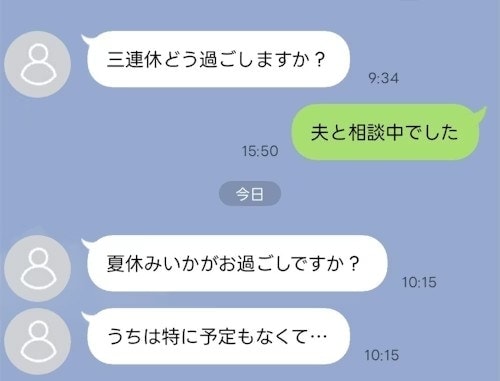 やたらベタベタこちらを都合良く扱ってくる近所のママ友と距離を置こうとしてるんですが、たまに「三連休どうすごしますか?😆」「夏休みいかがお過ごしですか?✨」みたいなメッセージや、お子さんの写真のみ送信されてきたりします😰(今も未読スルー中です)
