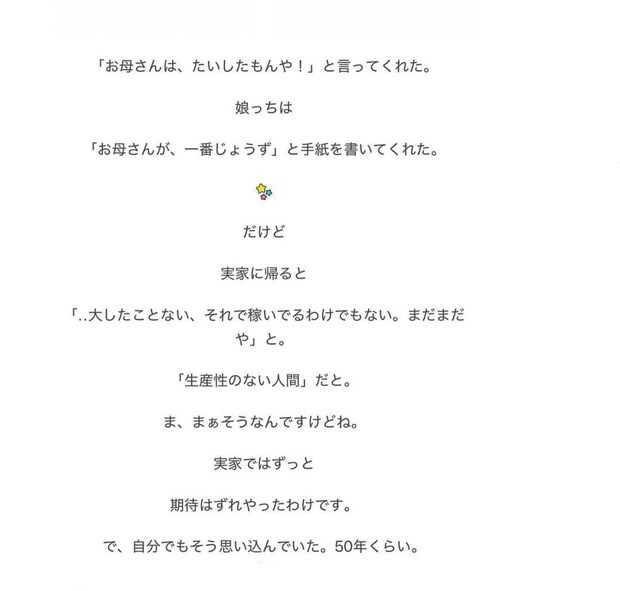 おかんさんは、小さいころから優秀な姉と比べられ、つらい気持ちを抱えていたそうです。その影響で、大人になってからも自分の努力をなかなか認めることができませんでした。しかし、夫や娘たちから「よく頑張っているね」といった言葉をかけられることで、少しずつ自分の頑張りを認められるようになっていきました。