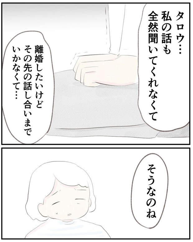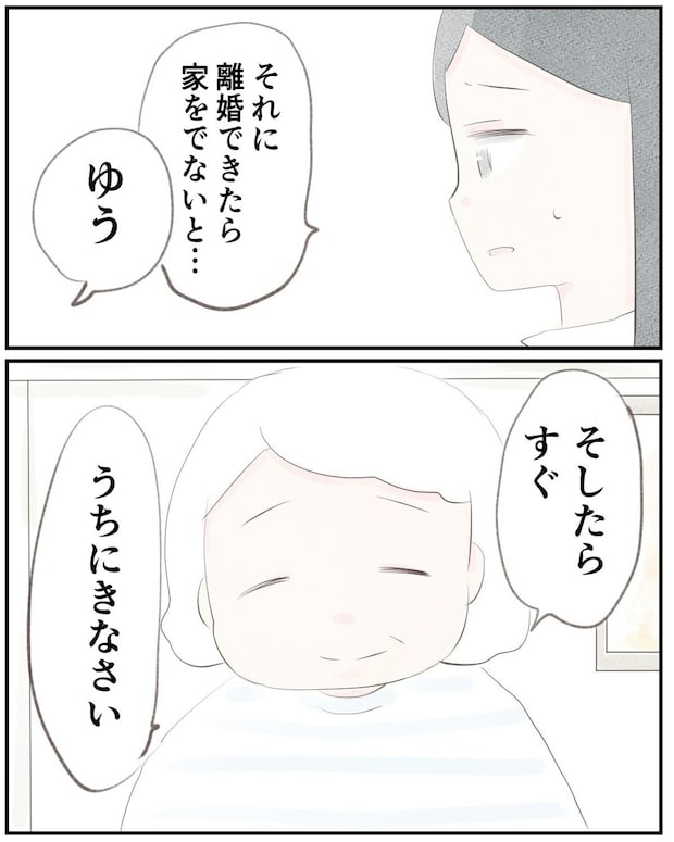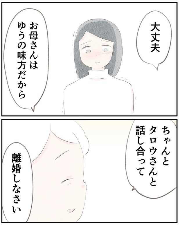ゆうさんは実家の母親に、夫との離婚について話をしました。ゆうさんが、夫と話し合いができない、離婚後は家をでなくてはいけない、と不安な気持ちを打ち明けると、母親は「ゆうさんの味方」だと言ってくれます。