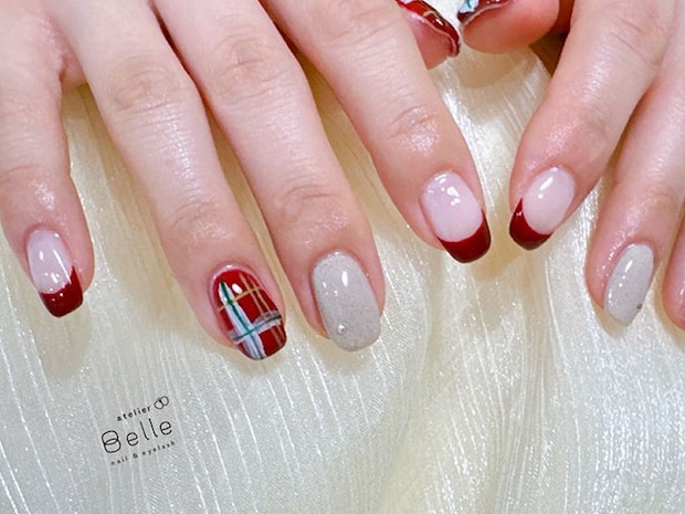 チェック柄と艶やかなフレンチネイルを組み合わせたネイルデザインをご紹介いたします。