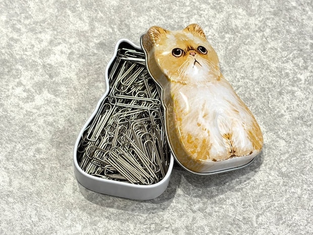 先ほどご紹介しました「キャットクランチ缶」よりも小さい缶なので、付箋、ヘアピン、ヘアゴム、絆創膏、リップクリームなど細々とした小物収納に最適!筆者は家で無造作に管理されていたクリップを入れてみました。