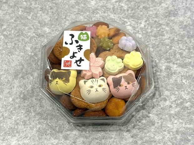 干菓子で作られた猫の顔や肉球が、なんとも愛らしい一品。パックには干菓子や金平糖、クッキーがびっしり詰まっていて価格は615円(税込)です。