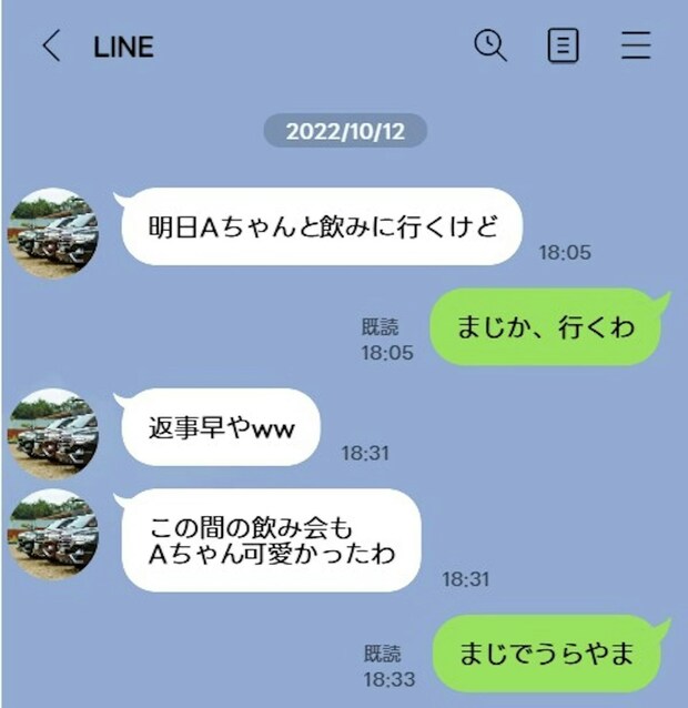 グループでですが、男女数人でAちゃん含めて何度も飲み会してたり、泊まりがけで釣りに行ったり…(これは事前報告か事後報告してくれてました)