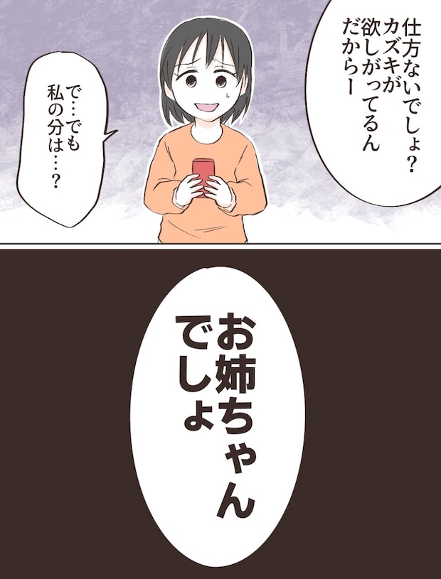 「仕方ないでしょ?カズキが欲しがってるんだから」母は、それが当然のことのように言いました。幼いながらも、その言葉が理不尽だと分かった私は、「で、でも私の分は・・・?」と恐る恐る尋ねます。しかし、返ってきたのは「お姉ちゃんでしょ」という、たった一言でした。