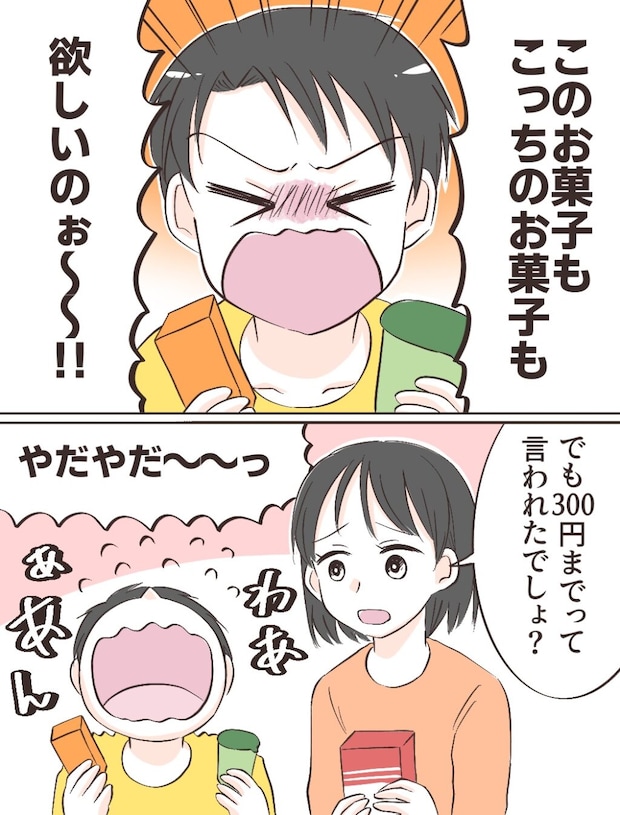 「このお菓子もこっちのお菓子も欲しいのぉ~!」と駄々をこねるカズキに、私は「でも300円までって言われたでしょ?」とやさしく言い聞かせます。けれど、どちらも諦めきれないのか、カズキの駄々はますますヒートアップ。「やだやだ~っ」と聞く耳を持たず、その場で泣き出してしまいました。